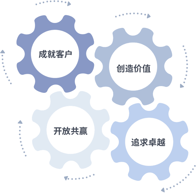 成就客户是一切决策的出发点,,创造价值是衡量所有工作的标准,,,,追求卓越是我们做事做人的态度,,开放共赢是我们的格局也是最终的结果。。。。价值观的齿轮环环相扣,,,,推动着组织里的每个人不断向前。。